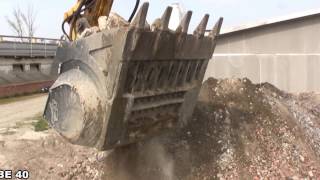 Die Welle des Brecherlöffels wird direkt von hubraumstarken Radialkolben-Hydraulikmotoren angetrieben. Ein Automatiksystem sorgt für die Umkehrung der Drehrichtung, falls die Welle blockiert. Der Brecherlöffel kann verschiedene Materialien zerkleinern, darunter Ziegel, Stahlbeton, Backsteine, natürliche Zuschlagstoffe, Beton, Fliesen, Glas und Asphaltplatten. Selbst bei Erde, feuchtem oder nassem Material und Bewehrungsstahl treten keine Leistungseinbußen auf.
